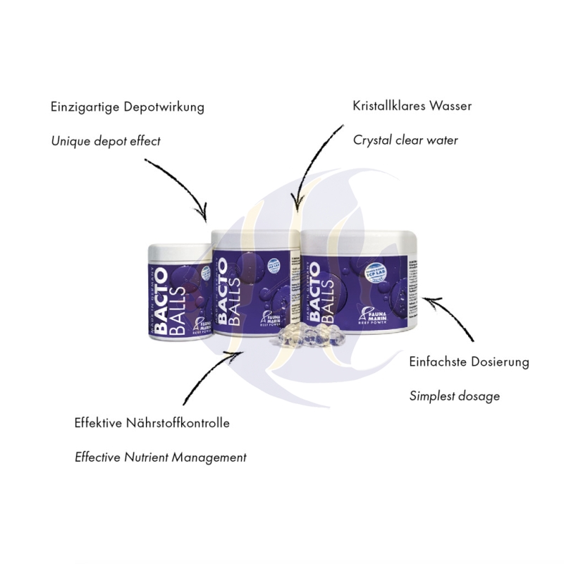 Mit Bacto Reef Balls erhalten Sie riffsichere Meerwasserbakterien (bei korrekter Anwendung und Filtration über leistungsgerechte Eiweißabschäumer), die sofort nach dem Einbringen in das Aquarium langsam und gleichmäßig in das Wasser abgegeben werden und dort mit Ihrer Arbeit anfangen: dem Abbau von Stickstoffen und Phosphaten.