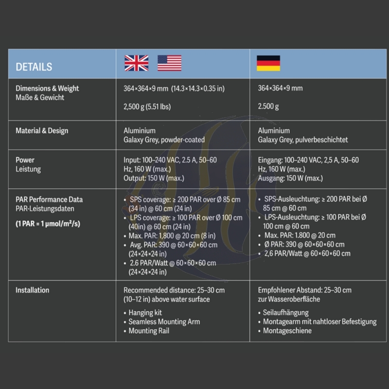 Diese Werte zeigen eindrucksvoll, wie effizient die Straton X mit nur 150 W Maximalleistung eine großflächige Beleuchtung für verschiedene Aquarientypen ermöglicht.