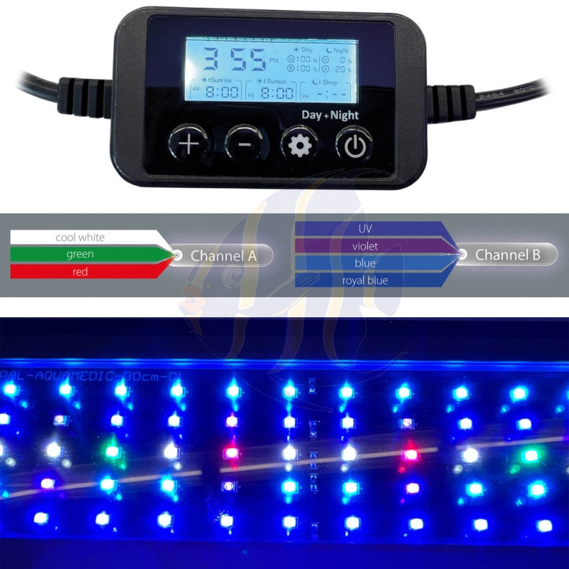 • Die speziell abgestimmte Lichtspektren-Kombination im blauen und weißen Bereich simuliert natürliche Lichtverhältnisse im Riff und bringt die fluoreszierenden Farben vieler Korallen besonders zur Geltung.
