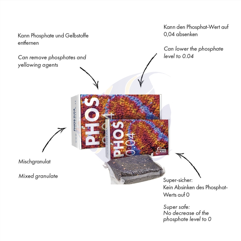 Fauna Marin Phos 0,04 ist ein einzigartiges Mischgranulat, das Phosphate und Gelbstoffe sicher aus dem Aquarienkreislauf entfernt.