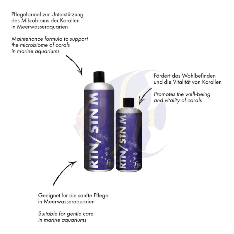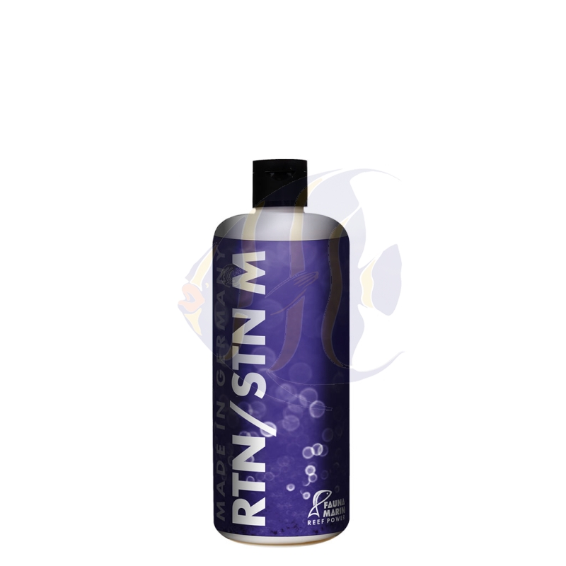 Fauna Marin RTN/STN M 500 ml (18447)Nachfolger der X-Serie: modernisiert und verbessertRTN/STN M — Pflegeformel zur Unterstützung des Mikrobioms der KorallenRTN/STN M wurde speziell entwickelt, um die natürliche Balance im Aquarium zu fördern und eine optimale Umgebung für Korallen zu schaffen. Es ist schonend und sicher bei sachgemäßer Anwendung.EigenschaftenFördert das Wohlbefinden und die Vitalität von KorallenUnterstützt das Mikrobiom der Korallen und trägt zur Stabilität des Aquariums beiGeeignet für die sanfte Pflege in MeerwasseraquarienAnwendungWir empfehlen eine Anwendungsdauer von 7–10 Tagen. Bei Bedarf kann die Anwendung verlängert werden. RTN/STN M wird direkt im Aquarium eingesetzt und ist bei sachgemäßer Verwendung sicher für andere Aquarienbewohner.Dosierung15 ml pro 100 l Aquarienvolumen täglich für 7–10 Tage.Die Zugabe erfolgt idealerweise in einen strömungsstarken Bereich.Während der Anwendung Aktivkohle aus dem System entfernen. Abschäumer, Adsorber und UV-Entkeimer können weiterhin betrieben werden.Zusätzlich: Während der Nutzung von RTN/STN M kann BACTO THERAPY verwendet werden: täglich 3 ml BACTO THERAPY pro 100 l Aquarienvolumen.Inhaltsstoffe:Wasser, natürliche Kräuterextrakte, Spurenelemente, Konservierungsmittel