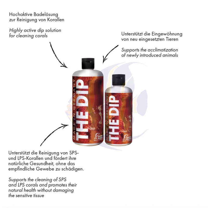 THE DIP ist nicht zur Verwendung IM Aquarium geeignet und nicht zum Baden von Fischen, Garnelen, Muscheln, Seeigeln und ähnlichen Tieren -diese Tiere sind vor dem Bad aus der Koralle zu entfernen.