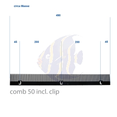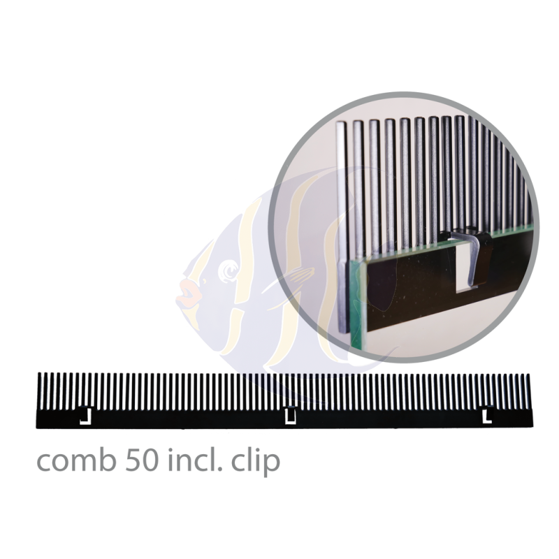 Überlaufkamm ohne Tasche, mit ClipsDas Wasser läuft gleichmäßig ab. Pflanzenteile und Schmutz werden zurückgehalten, Fische bleiben im Aquarium.Die Überlaufkämme sind in folgenden Versionen erhältlich:comb 50 incl. clipÜberlaufkamm ohne Tasche, mit ClipsDer Überlaufkamm wird durch die fest angebrachten Clips einfach auf die Glasscheibe aufgesteckt. Zur Reinigung kann der Überlaufkamm problemlos entfernt werden.Geeignet für Glasstärken 6 – 8 mmLänge ca. 50 cmHöhe: ca. 5,5 cmZahnlänge: ca. 3,7 cm