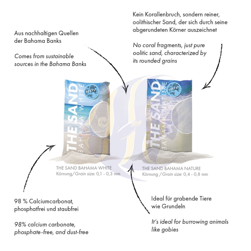 Unser Sand stammt aus nachhaltigen Quellen der Bahama Banks – kein Korallenbruch, sondern reiner, oolithischer Sand, der sich durch seine abgerundeten Körner auszeichnet. Diese Struktur ist nicht nur ästhetisch, sondern auch funktional: Ideal für grabende Tiere wie Grundeln, die diesen Sand besonders schätzen werden.