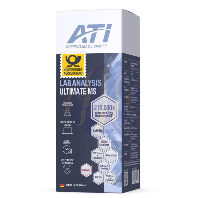 Gleichzeitig stellt das korrekte Messen der Wasserwerte eine große Herausforderung dar. Die hochpräzisen, professionellen ATI® Laboranalysen bieten Ihnen den Vorteil, dass die Hauptwasserwerte (z.B. Calcium, Magnesium, Salinität etc.) deutlich präziser und zuverlässiger bestimmt werden können als mit handelsüblichen Tröpfchentests. Des Weiteren erhalten Sie einen umfassenden Überblick über eine Vielzahl weiterer relevanter Elemente, die sich nur mit professioneller Laboranalytik bestimmen lassen.